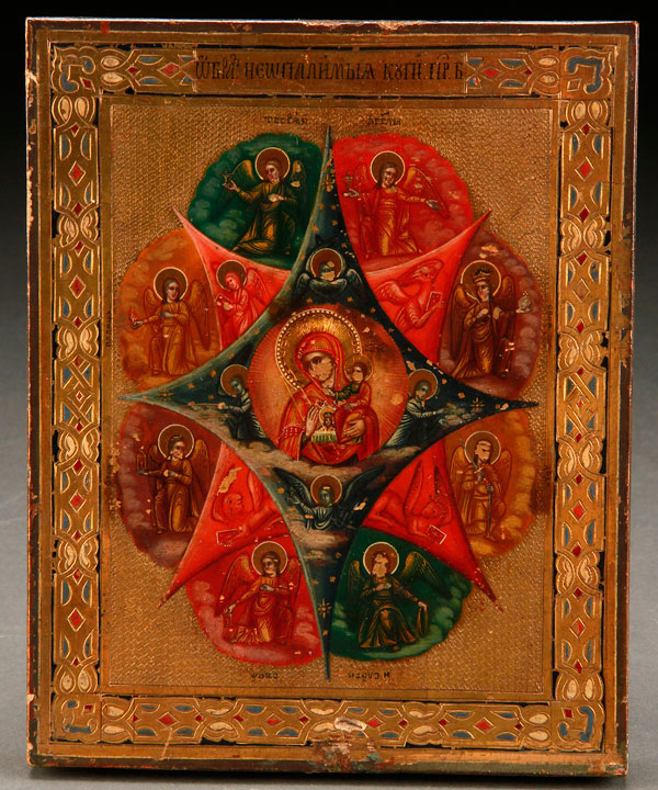 A RUSSIAN ICON OF THE UNBURNT THORNBUSH MOTHER OF GOD, CIRCA 1890. With scattered losses. 7 inches x 5.5 inches (17.5 x 14 cm).