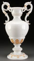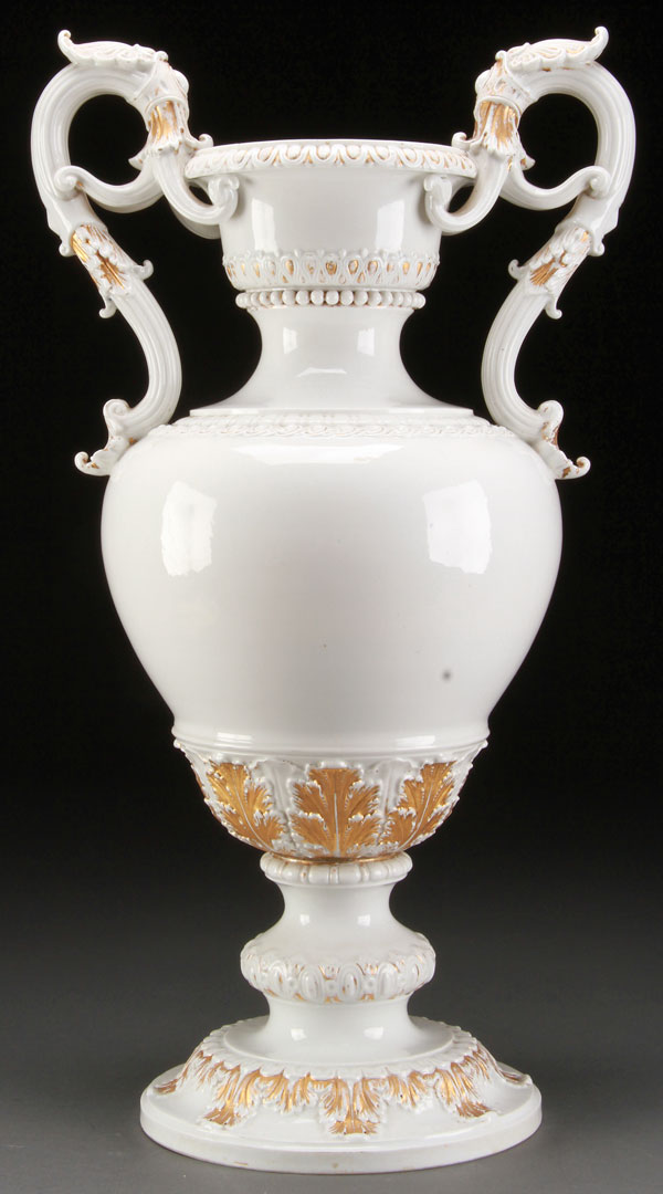 A LARGE MEISSEN TWO-HANDLED URN, LATE 19TH/EARLY 20TH CENTURY. With double scrolled handles on an ovoid body, raised on a pedestal with embossed acanthus leaves heightened in gilt. Blue underglaze crossed sword marks on base. Height 24 inches (61 cm).