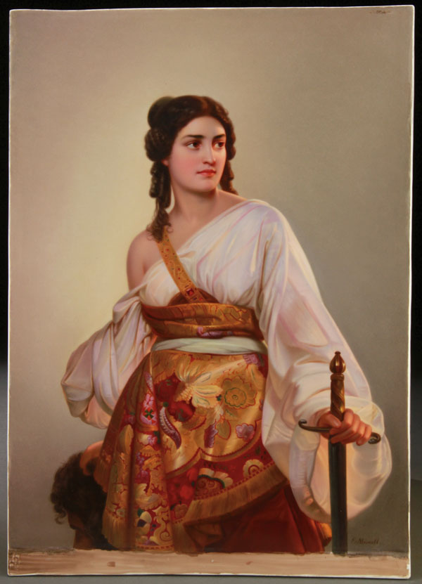 A LARGE AND EXCEPTIONAL KPM (BERLIN) HAND PAINTED PORCELAIN PLAQUE, CARL MEINELT (FL. 1860-1882), "JUDITH". After the painting by August Riedel housed at the Neue Pinakothek, Munich. Depicting the three quarters standing figure of Judith holding a sword and the head of Holofernes. Signed lower right "C. Meinelt". The verso with impressed KPM, scepter, and letter H. The porcelain 20.75 inches x 14.5 inches (52.5 x 37 cm).