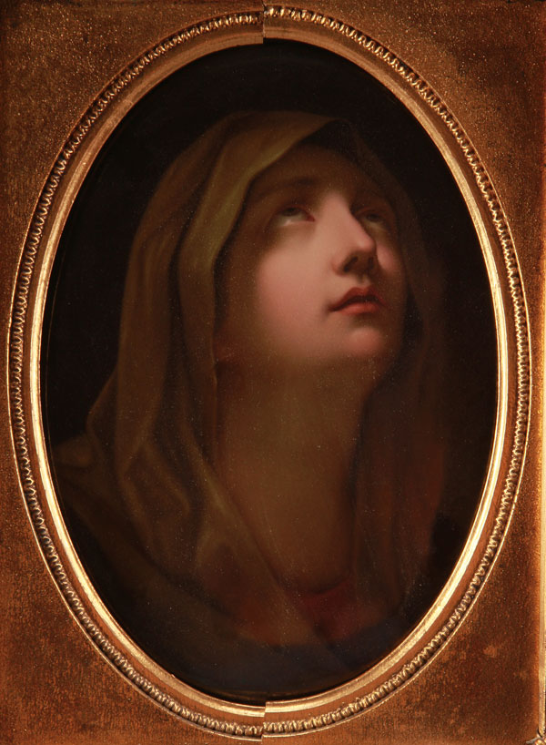 A KPM (BERLIN) HAND PAINTED PORCELAIN OVAL PLAQUE, LATE 19TH CENTURY. Depicting a young shrouded woman lifting her eyes as in prayer. The verso with impressed KPM and scepter. The porcelain 6 inches x 9 inches (15 x 23 cm). Contained in an ornate molded and gilt frame, 18.5 inches x 16 inches (47 x 40.5 cm).