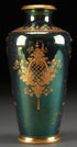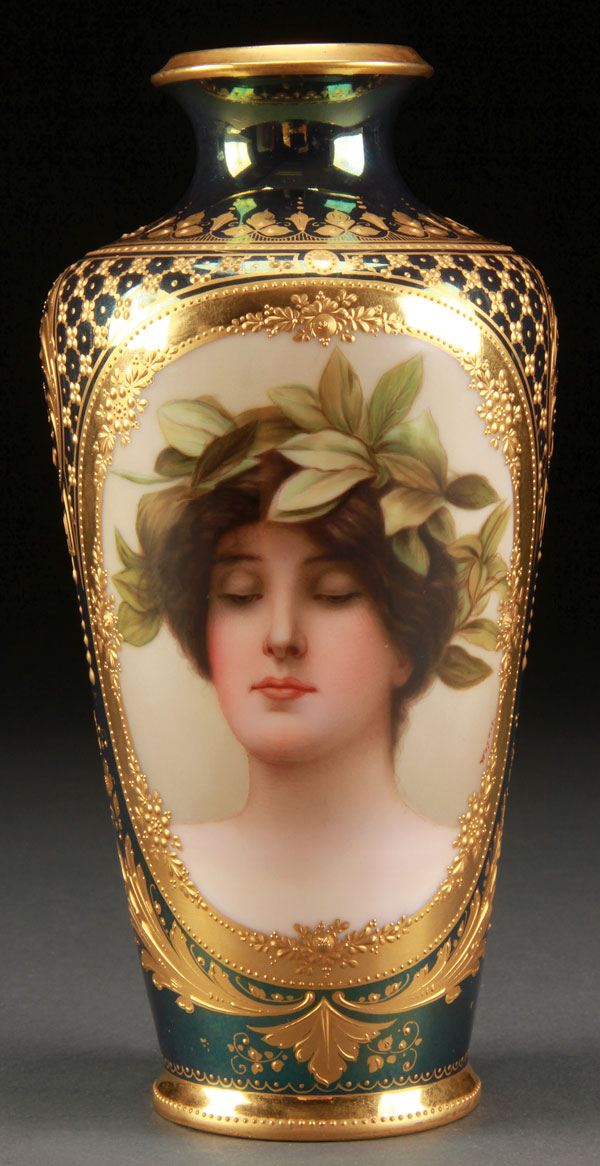 AN EXCEPTIONAL ROYAL VIENNA WAGNER SIGNED PORCELAIN PORTRAIT VASE, CIRCA 1900. Of Daphne within an enameled and raised gilt cartouche on a bluish green luster ground, surrounded by gilt scrolled foliates and beaded lattice. Signed lower right "Wagner", the base with blue beehive mark and inscribed "Daphne". Height 7 inches (18 cm).