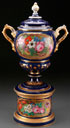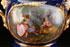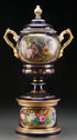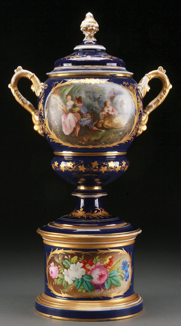 A LARGE AND IMPRESSIVE FRENCH PORCELAIN SEVRES STYLE LIDDED SCENIC URN ON PEDESTAL BASE, LATE 19TH CENTURY. Depicting a pastoral scene of lovers on obverse and hand painted florals within gilt cartouche on reverse, reserved on a cobalt blue ground. Raised on a socle pedestal base and further raised on a cylindrical decorated porcelain plinth. The base with spurious interlaced double L marks. Height 27.5 inches (70 cm).