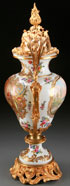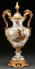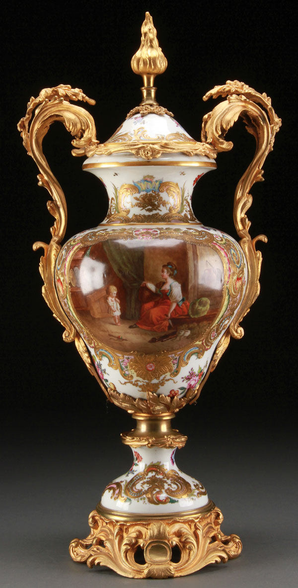 A VERY FINE SEVRES STYLE HAND PAINTED PORCELAIN AND GILT BRONZE LIDDED URN, 19TH CENTURY. The hand painted porcelain scene by John Baptiste Grueze. The obverse depicting a scene of motherhood after a painting by Fragonard and entitled “Dites Donc S’il Vous Plait”. The verso with a pastoral scene and each cartouche contained within raised gilt and scrolled foliate decorated borders surmounted by a well-tooled scrolled acanthus form gilt bronze mounted handles. Artist signed “J.B. Grueze” lower right. Height 27 inches (69 cm).