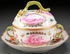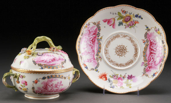 A LUDWIGSBURG TWO-HANDLED ECUELLE WITH COVER AND UNDERPLATE, LATE 18TH CENTURY. Finely painted with scenes of putto and cherubs in purple camaïeu with floral sprays and applied porcelain florals on lid. Blue underglaze crown backstamp on bowl and underplate. Diameter of underplate 8.75 inches (22 cm).