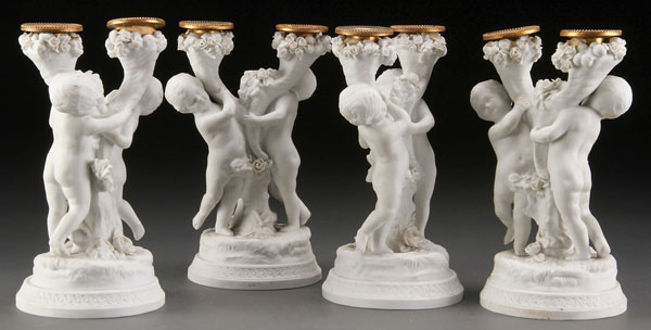 A SET OF FOUR SAMSON BISQUE AND GILT BRONZE FIGURAL CANDELABRA, 19TH CENTURY. Each modeled as two putto supporting cornucopia form candle arms with applied florals below gilt bronze candle sockets. Impressed interlaced double L marks on base. Height 9.5 inches (24 cm).
