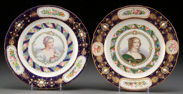 A PAIR OF 18TH CENTURY SEVRES STYLE FRENCH PORCELAIN PORTRAIT PLATES. Depicting "Madame Du Parabire" and "Henriette D'Angleterre". Each with finely gilt and enameled jeweled rims with floral cartouches. Spurious Sevres marks with date letters "B" and "C". Diameter 9.75 inches (24.5 cm).