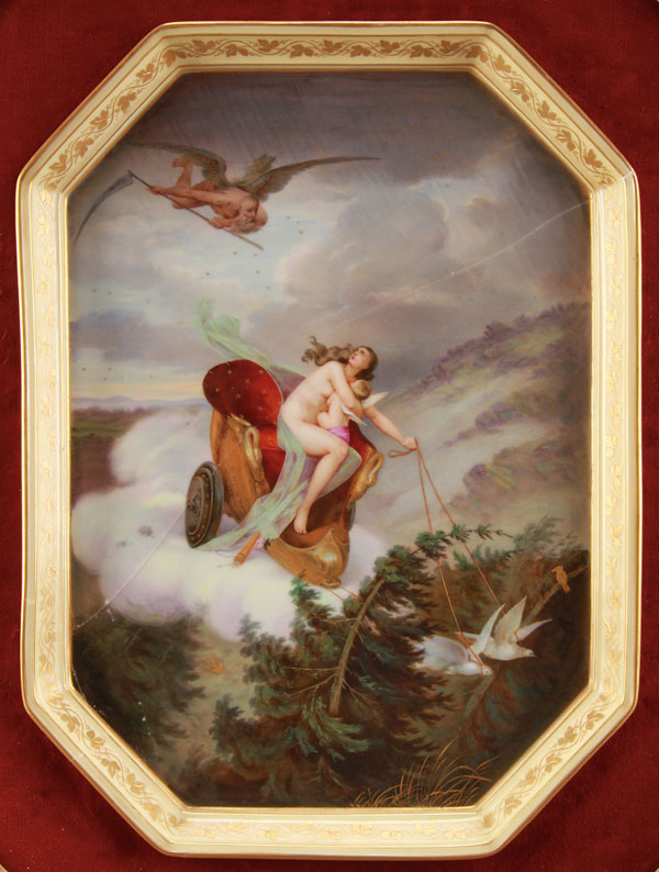 A ROYAL VIENNA HAND PAINTED PORCELAIN PLAQUE, LATE 19TH CENTURY. Depicting a scene with woman and cherub in chariot led by doves fleeing the Angel of Death entitled "Feit Vertreibt Amour". Contained in a carved and gilt frame. Blue underglaze Beehive mark on verso. Repairs. Porcelain 13.25 inches x 9.75 inches (33.5 x 25 cm). Overall 20.5 inches x 17 inches (52 x 43 cm). (Unillustrated)