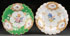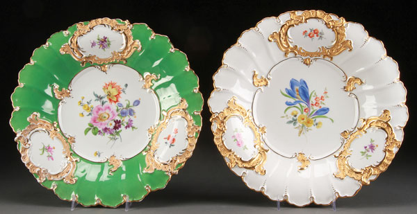 A GOOD PAIR OF MEISSEN HAND PAINTED CHARGERS, 20TH CENTURY. Of matching mold with embossed scrolled cartouches containing hand painted floral blossoms. One with a green ground rim. Blue underglaze crossed sword marks on base. Diameter 11.75 inches (30 cm).
