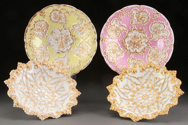 A GROUP OF FOUR MEISSEN PORCELAIN LOW BOWLS, 19TH/20TH CENTURY. Comprising two matching embossed fig leaf and interlocking stem, and two matching with scalloped cartouches containing wild flowers. Each with gilt decoration. Diameter 11 inches (28 cm).