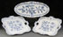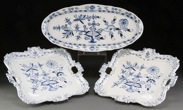 A THREE PIECE GROUP OF MEISSEN BLUE ONION DECORATED PORCELAIN, 20TH CENTURY. Comprising an elongated oval fish tray, and two matching square handled trays. Each painted in underglaze with blue onion pattern. Blue underglaze crossed sword marks on base. Length of tray 22 inches (56 cm) and square trays 60 inches (40.5 cm) square.