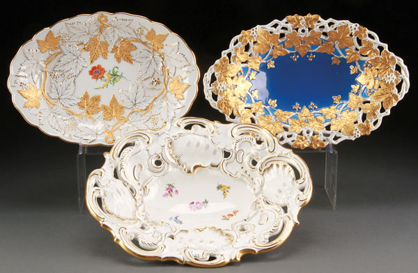 A GROUP OF THREE MEISSEN OVAL LOW BOWLS, 20TH CENTURY. Each with embossed leaf decoration heightened in gilt. The first with hand painted floral blossoms, the second with pierced rim and blue ground, the third with pierced rim and hand painted floral blossoms. The largest length 13.25 inches (33.5 cm).