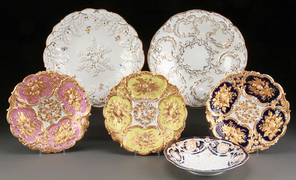 A GROUP OF SIX MEISSEN CABINET PLATES AND LOW BOWLS, 19TH/20TH CENTURY. Comprising three 9 inch (23 cm) with matching embossed fruit in cartouche pattern on a pink, yellow and blue ground; an acorn and oak leaf pattern with hand painted florals; a raised scallop and gilt pattern; and a morning glory on vine with cobalt ground. Each with blue underglaze crossed sword marks. The largest diameter 11 inches (28 cm).