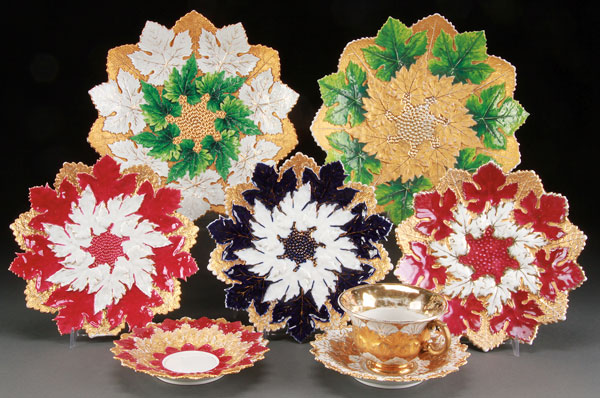 AN EIGHT PIECE GROUP OF MEISSEN CABINET PLATES, CUP AND SAUCERS, 19TH/20TH CENTURY. Each with matching overlapping grape leaf mold and heightened in gilt. Comprising two 9.25 inch (23.5 cm), three 7.75 inch (20 cm) (one damaged), two 6 inch (15 cm) saucers, and an associated pattern cup.