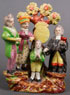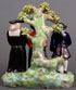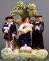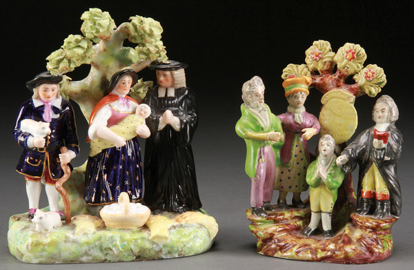 AN ENGLISH DERBY AND STAFFORDSHIRE PEARLWARE PORCELAIN GROUP, CIRCA 1820. Comprising a Staffordshire group of “The New Marriage Act”, modeled with a parson, clerk and a couple standing before flowering bocage, beneath a plaque inscribed 'THE NEW MARRIAGE ACT JOHN FRILL & ANN BOKE. AGE 21 THAT IS RIGHT. SAYS THE PARSON. AMEN. SAYS.THE.CLARK', on a hollow mound base. Some early repairs and some minor scattered flakes. Height 6.5 inches (16.5 cm). And an English Derby “Tithe Pig” figural group, depicting a farmer and wife presenting tithed goods, including their infant to a parson below a bocage decorated tree raised on a hollowed base with inscribed red Derby mark. Minor chips and flakes to bocage in tree. Height 7.5 inches (19 cm).