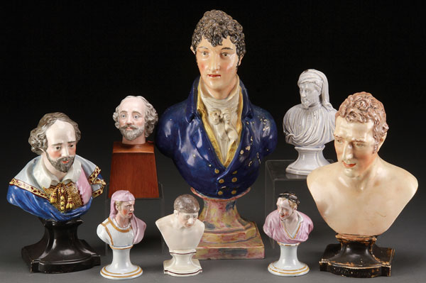 A GROUP OF EIGHT STAFFORDSHIRE PORTRAIT BUSTS, 19TH CENTURY. Of various size, including a "Wellington" by Caldwell, a "Shakespeare", and a miniature "Cicero". Largest height 16.75 inches (42.5 cm). (Unillustrated)