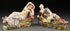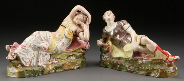 A PAIR OF STAFFORDSHIRE FIGURES OF CLEOPATRA AND ANTONY, 19TH CENTURY. Molded in reclining form with overglaze enamel decoration, repairs. Largest length 12 inches (30.5 cm).