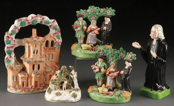 A GROUP OF FIVE STAFFORDSHIRE FIGURES, 18TH/19TH CENTURY. Comprising a three story building, two "Tithe Pig", a figure of "Wesley", and a fox with bocage in lair. Some losses. Largest height 9.25 inches (23.5 cm).
