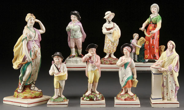 A GROUP OF NINE STAFFORDSHIRE PEARLWARE FIGURES, LATE 18TH/EARLY 19TH CENTURY. Each depicting Neo-classic and other figures, including "Diana". The largest 11 inches (25 cm).