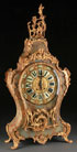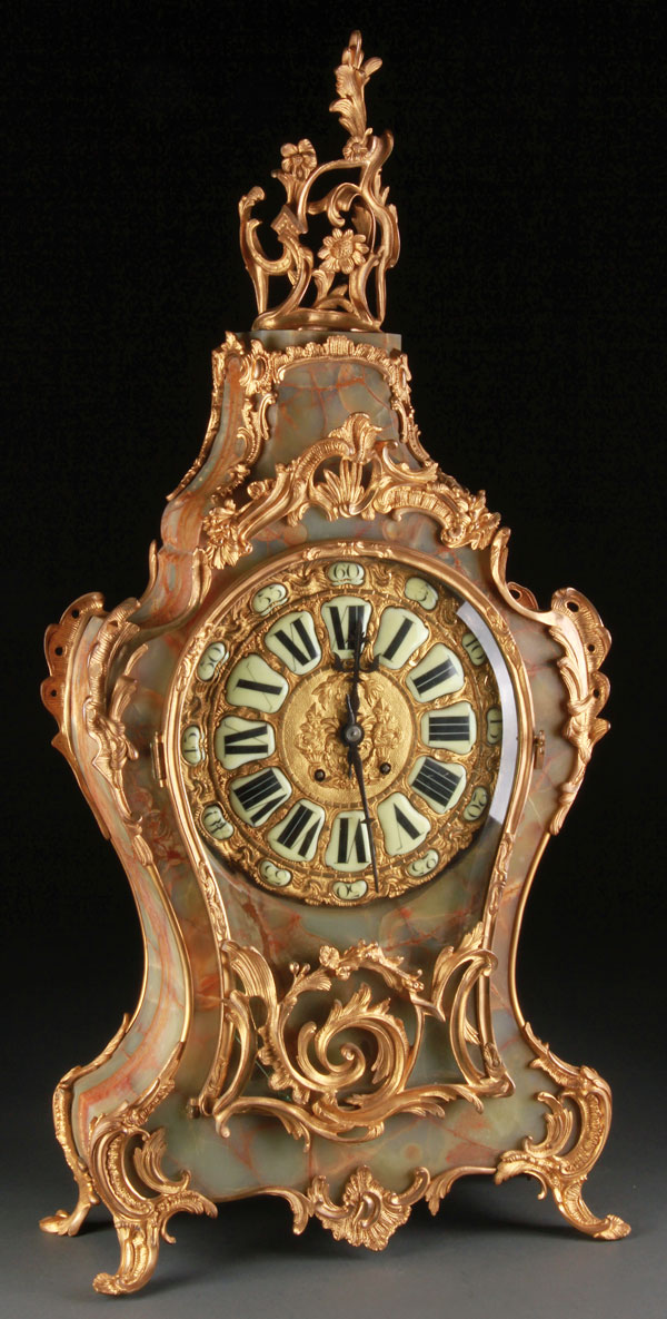 A LARGE AND IMPRESSIVE FRENCH LOUIS XV STYLE GILT BRONZE AND ONYX CASED MANTLE CLOCK, 19TH CENTURY. The waisted and scrolled onyx case in a semi-translucent pale greyish celadon colored onyx with amber veining, mounted with gilt bronze acanthus scrolls and foliates, containing a large embossed gilt bronze circular dial inset with porcelain chapters under a conforming beveled glass panel. Height 36.25 inches (92 cm).