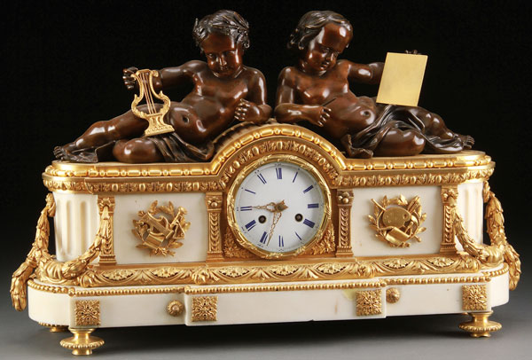 A LARGE FRENCH LOUIS XV STYLE GILT BRONZE AND PATINATED FIGURAL CLOCK OF THE ARTS, 19TH CENTURY. Modeled as a reclining figure of putti representing music and literature, raised on a shaped white alabaster base with finely tooled bronze mounts of garland and leaf forms flanking applied gilt bronze plaques with musical and artistic motifs. Further raised on a conforming beaded and squared rosette white alabaster plinth with bronze terminals. Height 15 inches( 38 cm), length 23.5 inches (59.5 cm).