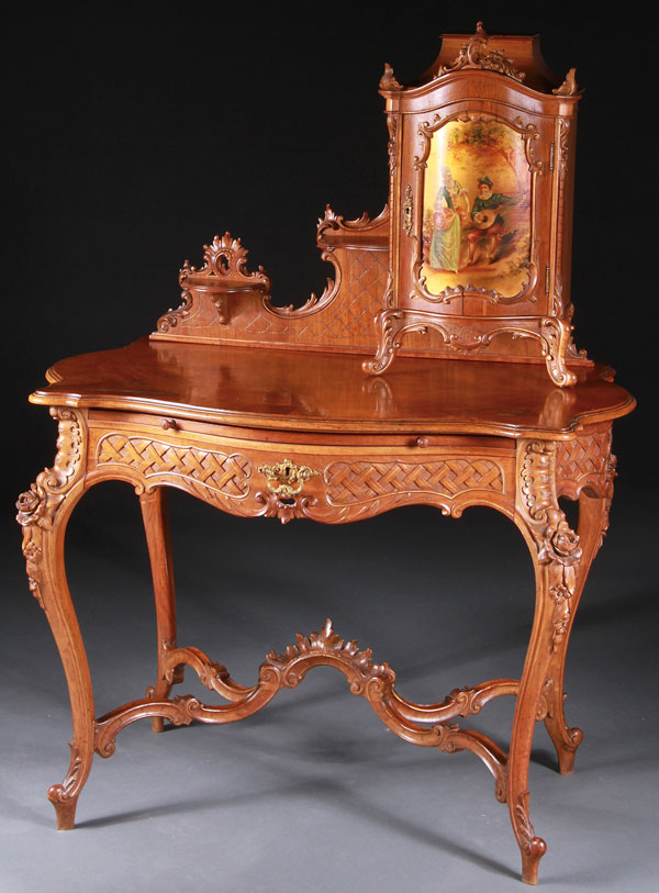 AN VERY FINE ITALIAN ROCOCO CARVED WALNUT AND VERNI MARTIN STYLE WRITING DESK, 19TH CENTURY. The turtle back shaped writing surface below a birdseye maple lined cabinet raised on scroll carved legs and with bombay door front finely painted with a romantic scene on a gilt ground. The table with birdseye maple lined drawer and bombay front carved with crossed lattice panels in good relief below a slide-out velour inset writing surface and raised on cabriole form legs with large open rose carved knees joined by double C scrolled X form stretchers. Height 55 inches (140 cm), width 41.5 inches (105.5 cm), depth 25.5 inches (65 cm).