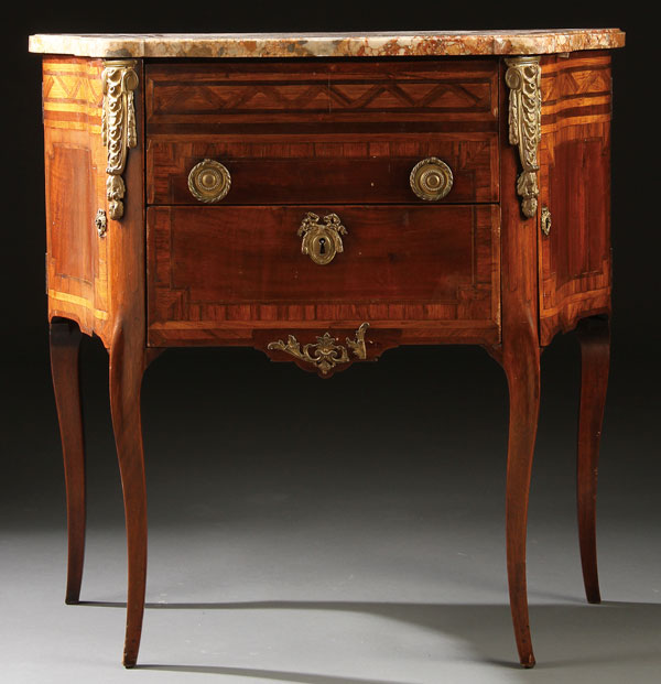 A FRENCH LOUIS XVI STYLE GILT BRONZE MOUNTED MARBLE TOP MARQUETRY COMMODE, 19TH CENTURY. Walnut with kingwood and satinwood veneers, two drawers with gilt bronze pulls and locking side cupboards raised on saber form legs below a "breche d'alep" marble top. Height 33 inches (84 cm), width 34 inches (86.5 cm).