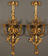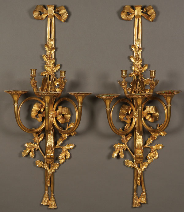 A PAIR OF LARGE AND IMPRESSIVE FRENCH SECOND EMPIRE GILT BRONZE WALL SCONCES, 19TH/20TH CENTURY. Each with two scrolled candle arms with sculpted camel head terminals and dragonfly wings above three coiled trumpet form flower coupes mounted on a tassel form wall bracket with oak leaf and acorn branches and sculpted deer hoof trophy mounts. Length 43.75 inches (111.25 cm), width 19 inches (48.25 cm).