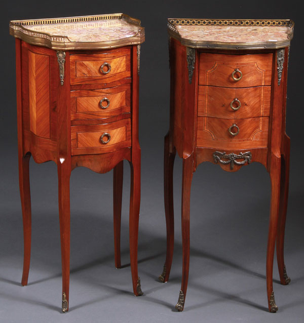 A MATCHING PAIR OF FRENCH LOUIS XVI STYLE MAHOGANY AND KINGWOOD MARBLE TOP TABLES EN CHIFFONNIERE, 20TH CENTURY. Bombay fronts with three drawers and gilt bronze mounts below a "breche d'alep" marble top. Height 32 inches (81.25 cm), width 14 inches (35.5 cm), depth 10.5 inches (26.5 cm).