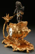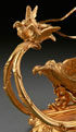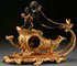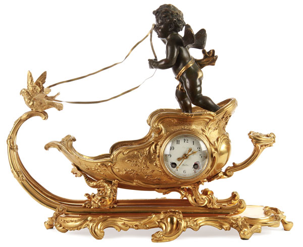 A FRENCH RESTAURATION FIGURAL GILT AND PATINATED BRONZE SLEIGH FORM MANTLE CLOCK, 19TH CENTURY. Depicting a winged nymph atop a scallop form sleigh raised on figural dolphin feet. Replaced movement. Height 12.5 inches (31.8 cm), length 15inches (38.1 cm).