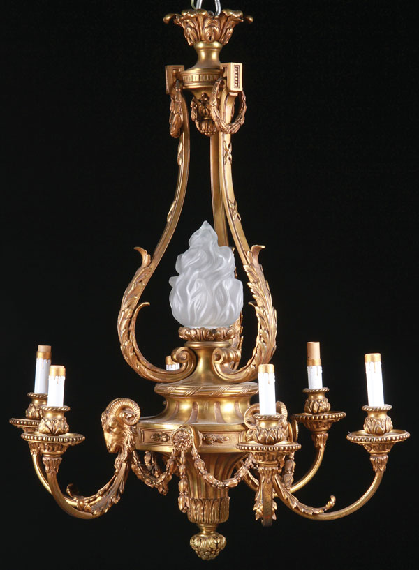 A VERY FINE FRENCH LOUIS XVI STYLE GILT BRONZE CHANDELIER, EARLY 20TH CENTURY. The central waisted circular form below an embossed and frosted flame form shade suspended from three scrolled foliate arms with loose ring garlands, mounted with four large sculpted rams heads each suspending a scrolled arm candle socket with acanthus leaf mounts. Length 34 inches (86.5 cm).