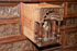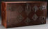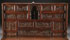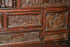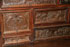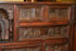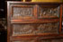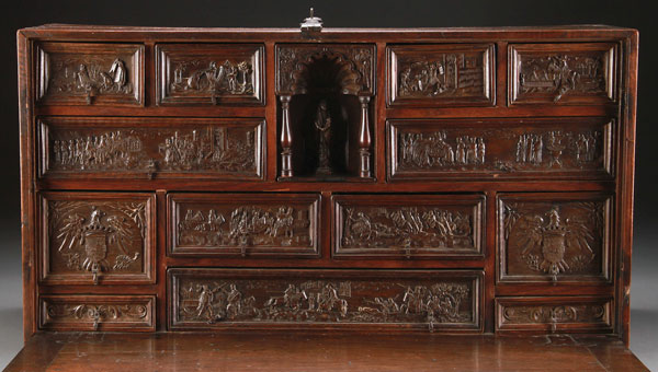 A 17TH CENTURY SPANISH BAROQUE WALNUT AND WROUGHT IRON MOUNTED VARGUENO (SECRETARY) TOP. The rectangular case with scrolling iron lockplate, open strapwork and four sliding latches opening to an interior fitted with 14 drawers of various size, each finely carved in relief with later (probably 19th century) drawer fronts depicting medieval battle scenes, the center drawer in the form of a scalloped niche with a fully carved figure of a Madonna and Child, and with two drawers lower left and right, each carved with an Armorial eagle grasping a crowned shield/crest. Length 37 inches, height 19.5 inches, diameter 13 inches.