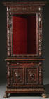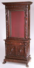 AN ITALIAN RENAISSANCE STYLE WALNUT SECRETARY, 19TH CENTURY. With glazed bookcase top carved with two standing figures on brackets above facial masks and fruit pendants below an everted cornice with carved scrollwork in relief and raised on a cabinet base with drawer, pull-out writing top and two doors with lion's facial masks within strapwork medallions. Height 85 inches (216 cm), width 39 inches (99 cm), depth 20 inches (51 cm).