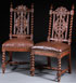 A PAIR OF ENGLISH CARVED OAK GOTHIC REVIVAL SIDE CHAIRS, EARLY 19TH CENTURY. With open work scroll carved backs and leather seats raised on barley twist legs. Height 43.5 inches (110.5 cm), width 19 inches (48.25 cm), depth 17.5 inches (44.5 cm).