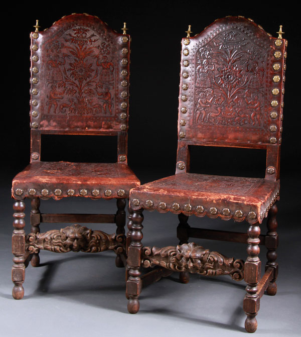 A PAIR OF ENGLISH GOTHIC REVIVAL CARVED OAK AND TOOLED LEATHER SIDE CHAIRS, 19TH CENTURY. The tooled scenic leather backs decorated with provincial figures, florals, and animal forms, mounted with large brass rosettes and turned brass terminals above a scrolled foliate seat cushion raised on turned legs joined by a grotesque facial mask stretcher. Height 43.75 inches (111.25 cm), width 19.25 inches (49 cm), depth 17 inches (43.25 cm).