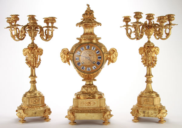 A LARGE LOUIS XVI STYLE GILT BRONZE CLOCK GARNITURE, 19TH CENTURY. Of urn form with large sculpted rams head handles flanking an inset clock movement with enameled chapters, raised on an octagonal plinth. With matching scroll arm seven light candelabra. Clock height 23.5 inches (59.7 cm), candelabra height 21.25 inches (54 cm).