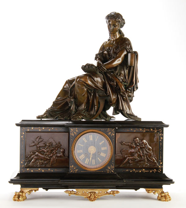 A LARGE AND IMPRESSIVE FRENCH NEOCLASSICAL PATINATED BRONZE AND BLACK SLATE MANTLE CLOCK, RETAILED BY TIFFANY & COMPANY, NEW YORK, LATE 19TH CENTURY. Mounted with a large bronze figure of classical woman reading a book after Theodore Doriot, raised on a rectangular block from polished slate case. The case with Neoclassic bronze panels sculpted in an Egyptian motif flanking a circular clock dial inscribed "Tiffany & Co., New York", raised on gilt bronze lion paw feet. Height 24 inches (61 cm), length 20.6 inches (52.4 cm).