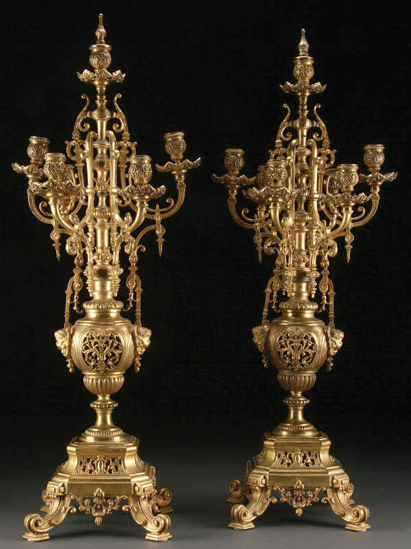 A LARGE PAIR OF CONTINENTAL RENAISSANCE REVIVAL GILT BRONZE CANDELABRA, 19TH CENTURY. Of urn form, mounted with winged cherub head handles below six scrolled strapwork and foliate candle arms and raised on a reticulated plinth with scrolled legs. Height 32 inches (81.3 cm).