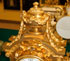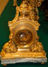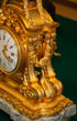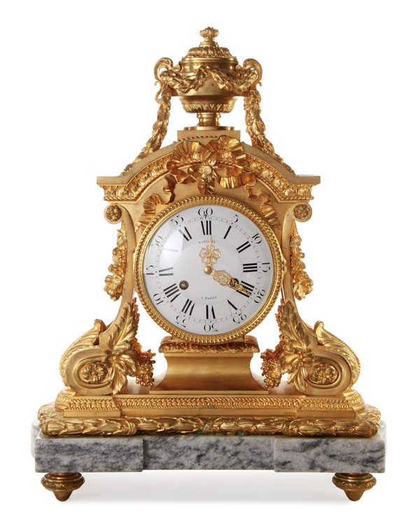 A LARGE AND IMPRESSIVE FRENCH LOUIS XV STYLE GILT BRONZE AND MARBLE MANTLE CLOCK, 19TH CENTURY. The domed case with applied undulating ribbon bow and surmounted with a handled urn and draped garland, raised on four scrolled legs with acanthus leaves and berry clusters, above a shaped marble plinth. The clock dial enameled "Marquis" and "Paris". Height 21.25 inches (54 cm).