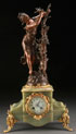 A VICTORIAN "LE NID" FIGURAL PARLOR CLOCK, AFTER MOREAU, LATE 19TH CENTURY. The bronzed metal figure of a woman with bird raised on a green onyx case with gilt metal mounts. Height 24.25 inches (61.5 cm).
