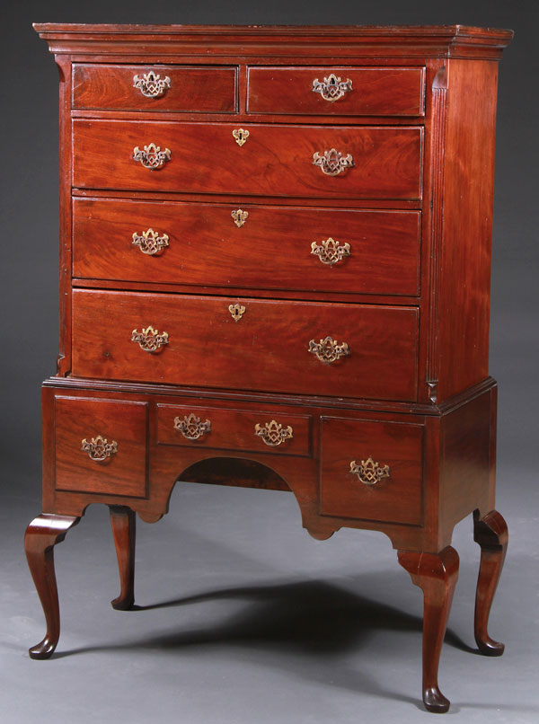 A GEORGE III MAHOGANY CHEST ON LATER STAND. The five drawer top with replaced brass pulls and fluted chamfered corners resting on a later (early to mid-20th century) stand with false drawer fronts. Height 65 inches (165 cm), width 44 inches (111.75 cm), depth 21.5 inches (54.5 cm).