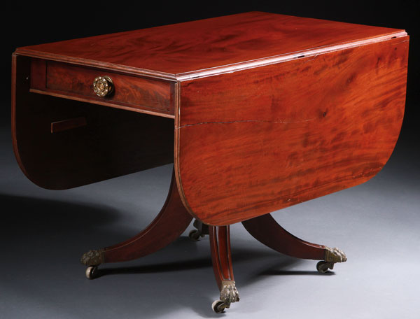 A VERY FINE EARLY AMERICAN DROP LEAF MAHOGANY BREAKFAST TABLE, EARLY 19TH CENTURY. With D shaped drop leaves and single drawer. Raised on four splayed legs with bronze lion claw terminals and casters. Height 28.75 inches (73 cm), width 44.25 inches (112 cm), length with leaves out 58 inches (146 cm).