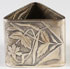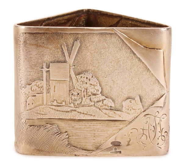 A FABERGÉ SILVER NAPKIN RING, MOSCOW, 1896-1908. Of triangular form, each panel sculpted in low relief and depicting a landscape with windmill, a bird resting on a branch and floral motif with engraved interlocking Cyrillic monogram. Hallmarked Moscow 1896-1908, stamped in Cyrillic KFABERGE beneath the Imperial Warrant and 84 silver standard. Greatest width 2 inches (5.2 cm).
