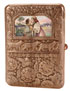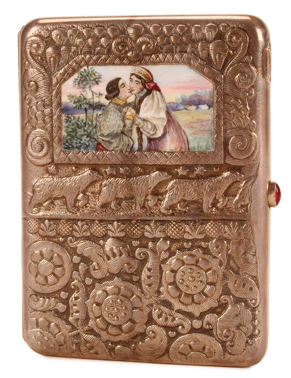 A VERY FINE RUSSIAN SILVER AND EN PLEIN ENAMEL CIGARETTE CASE, IN THE NEO SLAVIC TASTE, MOSCOW, 1908-1917. The lower portion of the hinged lid cast in stylized flower forms beneath a band of marching polar bears above which is a framed reserve with en plein enamel painted scene of an amorous couple in a landscape and wearing traditional Russian costumes. The interior brightly gilded, hallmarked Moscow 1908-1917, Cyrillic maker's mark DN probably for Dmitry Nikolaev, 84 silver standard and later control marks, and with red cabochon thumbpiece. Length 4.6 inches (11.6 cm).