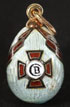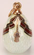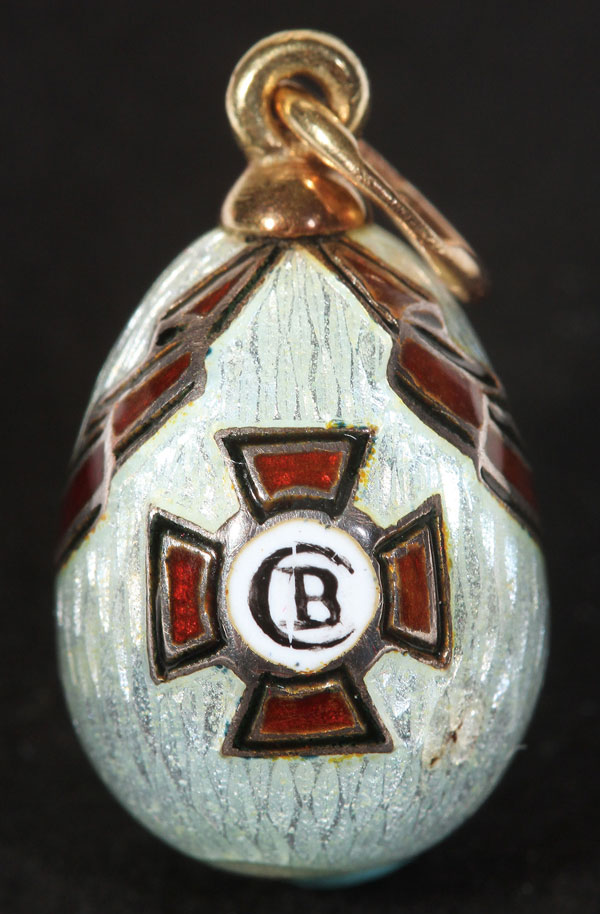 A RUSSIAN GOLD AND GUILLOCHÉ ENAMEL PENDANT EGG OF THE ORDER OF ST. VLADIMIR, ST. PETERSBURG, 1898-1908. The egg enameled in translucent silver-white over an engine-turned ground and with applied, enameled cross and sash of the order of St. Vladimir. The suspension loop hallmarked St. Petersburg, 1898-1908, 56 gold standard (14k) and maker's mark OK, most likely for Olov Koistinen. Height 7/8 inch (2.2 cm). Together with later leather custom fitted case.