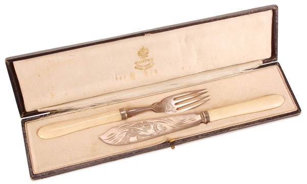 A FABERGÉ SILVER AND IVORY CASED FISH SET, MOSCOW, 1908-1917. Comprising a matching silver fish knife and fork, both engraved with fish motifs and set with ivory handles. Each hallmarked Moscow 1908-1917, Cyrillic maker's mark KFABERGE beneath the Imperial Warrant and 84 silver standard. Contained in their original silk lined, leather covered, custom fitted case. Knife length 8.25 inches (21.5 cm).