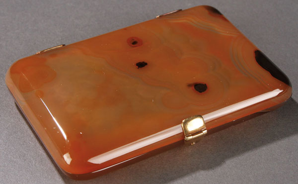 A GOLD MOUNTED CARNELIAN AGATE CASE, CIRCA 1890, POSSIBLY RUSSIAN. The rectangular case with rounded corners. The lid with gold hinges and latch, apparently unmarked. Length 3.3 inches (8.2 cm).
