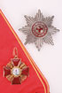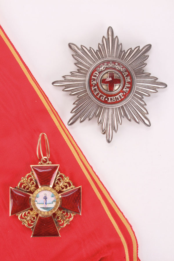 AN IMPERIAL RUSSIAN GOLD & ENAMEL CROSS, & SILVER & ENAMEL STAR & SILK SASH OF THE ORDER OF ST. ANNE 1st CLASS, EDUARD, ST. PETERSBURG, 1908-1917. Verso of the silver-gilt and enameled breast star with large folding flat pin hallmarked St. Petersburg circa 1908-1917, 84 silver standard and in Cyrillic ЗДУАРД and the initials ВД for Vladimir Dinakov (see Postnikova-Loseva #1242 and 1440). The center of the breast star with translucent red enamel on a stippled gilt ground encircled by a similarly enameled border set with the abbreviated motto of the Order, AMAN•JUST•PIET•FID for AMANTIBUS JUSTITIAM, PIETATEM, FIDEM (To those who love justice, piety and fidelity). The loop of the gold and enameled cross hallmarked St. Petersburg 1908-1917 and with 56 (14k) gold standard and also marked beneath the translucent enamel in Cyrillic ЗДУАРД, and with gold attachment wire. Together with original moiré silk sash. The Star 3.6 inches (9.4 cm), Cross 2.25 inches (5.5 cm), the sash 60 inches (152 cm).