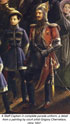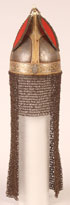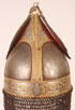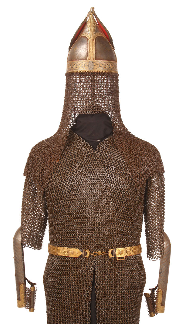 A RARE AND IMPORTANT IMPERIAL RUSSIAN CHAINMAIL AND ARMOR OFFICER'S SET OF THE CAUCASUS-MOUNTAINS’ HALF-SQUADRON OF HIS IMPERIAL MAJESTY'S OWN KONVOI ESCORT HALF-SQUADRON TULA, CIRCA 1835-1840. Comprising a matching officer's set of chainmail and armor consisting of a chainmail shirt, tall Taj type helmet, arm guards and belt. The three quarters length chainmail shirt with half length sleeves, open collar and single vent front skirt. The Taj helmet in traditional Circussian form, with metal skull surmounted by small gilt silver finial from which is suspended two red "tongues" and mounted with parcel gilt silver panels profusely chased and nielloed, with inscriptions of Koran verses in Arabic including Allah Akbar (God is Great!) on the front cartouche. With steel chainmail face curtain and side and back curtains falling to the shoulders. En suite steel arm guards with chased banding and mounted with silver-gilt decorative elements and with chain link steel and silver-gilt mounted cuffs with matching silver-gilt buckles. Together with a red leather belt decorated with interlocking chased silver-gilt panels and double seahorse buckle, typical of mid-19th century Imperial Russian officer uniforms. Helmet with indistinguishable maker's mark and all silver and silver-gilt elements stamped with 84 silver standard. Height of helmet from finial to bottom of chain 27 inches (68.5 cm), belt length 37 inches (94 cm), arm guard length 11.5 inches (29 cm).