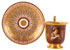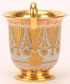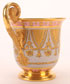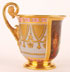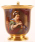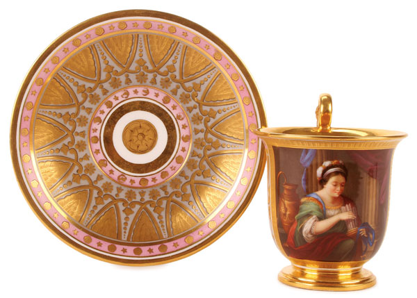A VERY FINE HAND PAINTED RUSSIAN PORCELAIN CUP AND SAUCER, IMPERIAL PORCELAIN FACTORY, ST. PETERSBURG, FIRST HALF 19TH CENTURY. Of tapering cylindrical form with a flaring rim and on a spreading foot, the front painted with a Neoclassical scene of a woman holding a quiver of arrows in a Roman interior, probably Venus with cupid's arrows. Framed in a gilt, leaf-tipped decorated border, the backside with gilt leaf tips, swags, bell flowers and shell forms on a grey mottled ground with pink borders, and the molded foliate scroll handle with mask terminal and with gilt interior sides. The white ground circular saucer decorated with a gilt flower head in the sunken cavetto, surrounded by gilt bands and gilt decoration on a pink ground and further out, gilt flower tip and swags against a grey ground with pink border decorated with gilt stars and flower heads, and with gilt rim. The underside of cup with faint inscribed underglaze Cyrillic P and number 5, the underside of saucer with trace over glaze red inventory numbers and indistinguishable underglaze incised marks. The cup height 4.5 inches (11.5 cm), the saucer diameter 6.7 inches (7 cm).