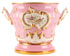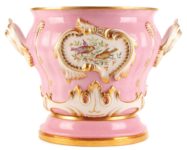 A LARGE AND IMPRESSIVE RUSSIAN IMPERIAL PORCELAIN FACTORY JARDINIÈRE AND STAND, ST. PETERSBURG, PERIOD OF ALEXANDER II. Of compressed bulbous form, the sides with two extending acanthus gilt highlighted handles, the front and back with ornate acanthus cartouches molded in high relief and each with hand painted scenes of birds amidst fruit trees, the base with raised strapwork and below the sides with hand painted butterflies on a pink ground with gilt highlights. The deep circular base stand with green underglaze mark of Alexander II beneath the Imperial Crown. Overall height 11.25 inches (29 cm) greatest width 16 inches (41 cm).